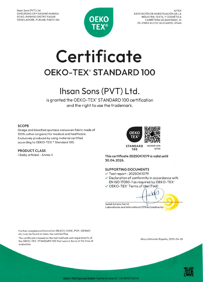 OEKO-TEX (100% ORGANIC COTTON SPUNLACE NONWOVEN)